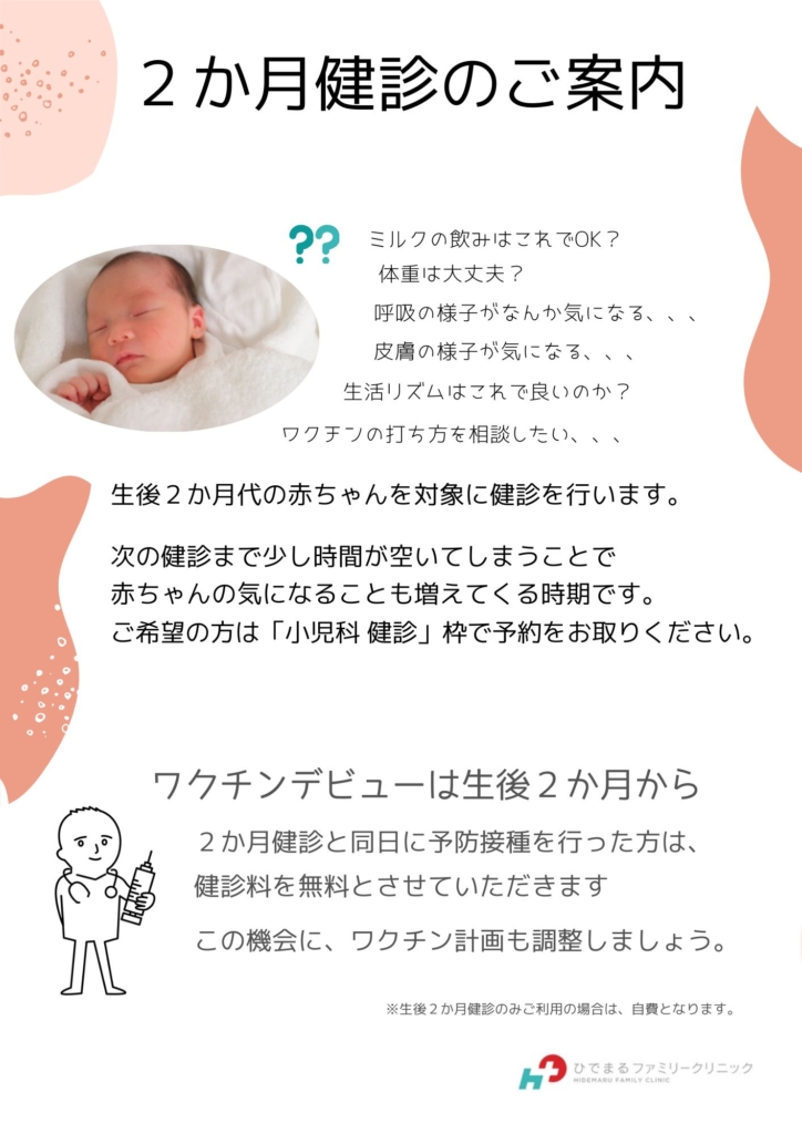 生後2か月を迎えると、ワクチン接種がスタートします。多くの赤ちゃんはこのワクチンデビューで小児科と「初めまして」となりますが、この機会に2か月健診も一緒にいかがでしょうか❓️