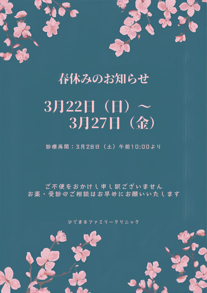 ひでまる春休みのお知らせ 2026.03.05 平素より「ひでまるファミリークリニック」をご愛顧いただきありがとうございます。 年末年始期間の診療に伴う振替休日として、誠に勝手ながら以下の期間をひでまるの「春休み」とさせていただきます。 【休診期間】 2026年3月22日(日) 〜 2026年3月27日(金) 休診期間中は、お電話やメッセージへの対応ができかねます。 お薬の処方や受診をご希望の方は、お早めにご相談いただけますと幸いです。 皆様にはご不便をおかけし大変申し訳ありません。何卒ご理解とご協力のほど、よろしくお願い申し上げます。 前の記事 次の記事